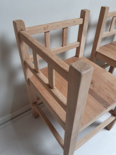 Verborgen onder een dikke laag bruine meubelbeits zaten deze prachtige eiken stoeltjes. De stoelen ontlenen hun houten zit aan een oude eiken kledingkast. Klaar om te gebruiken als gezellige kletsstoeltjes in de erker of naast de haard.